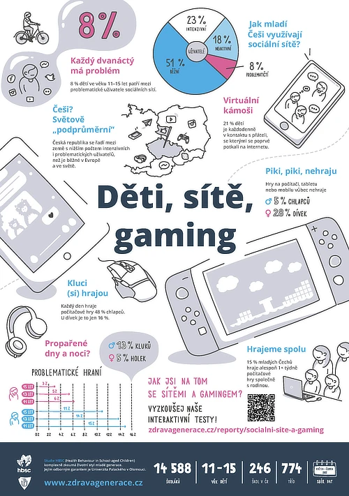 Mezi tzv. problematické uživatele sociálních sítí patří 8 % mladých lidí ve věku 11 až 15 let. Je to o tři procentní body více, než kolik jich v Česku odhalila mezinárodní studie HBSC (Health Behaviour in School-Aged Children) při posledním republikovém sběru dat v roce 2018. Potíže se sociálními sítěmi reportují ve větší míře děvčata než chlapci. U chlapců však studie potvrdila jinou oblast, ve které dominují: hraní počítačových her.